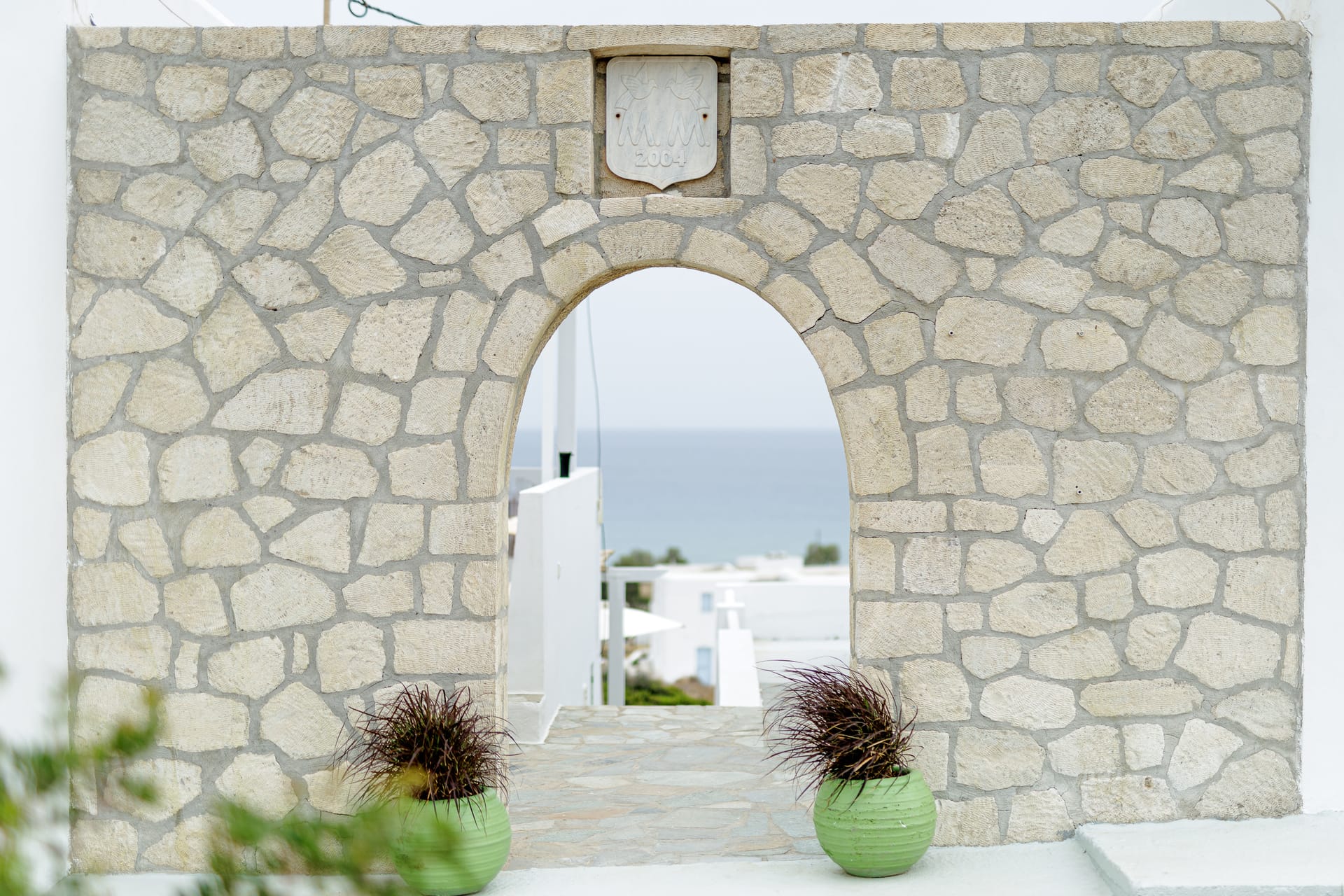 Coming off the boat you follow the cars that exit the port and take the slightly uphill road that leads you to the island’s main village, Chorio. After approximately 100 metres, where the road forks, turn left. We have a sign at that point that shows the direction for all Aria Hotel properties of the island. Simply follow the one for Alikaki.