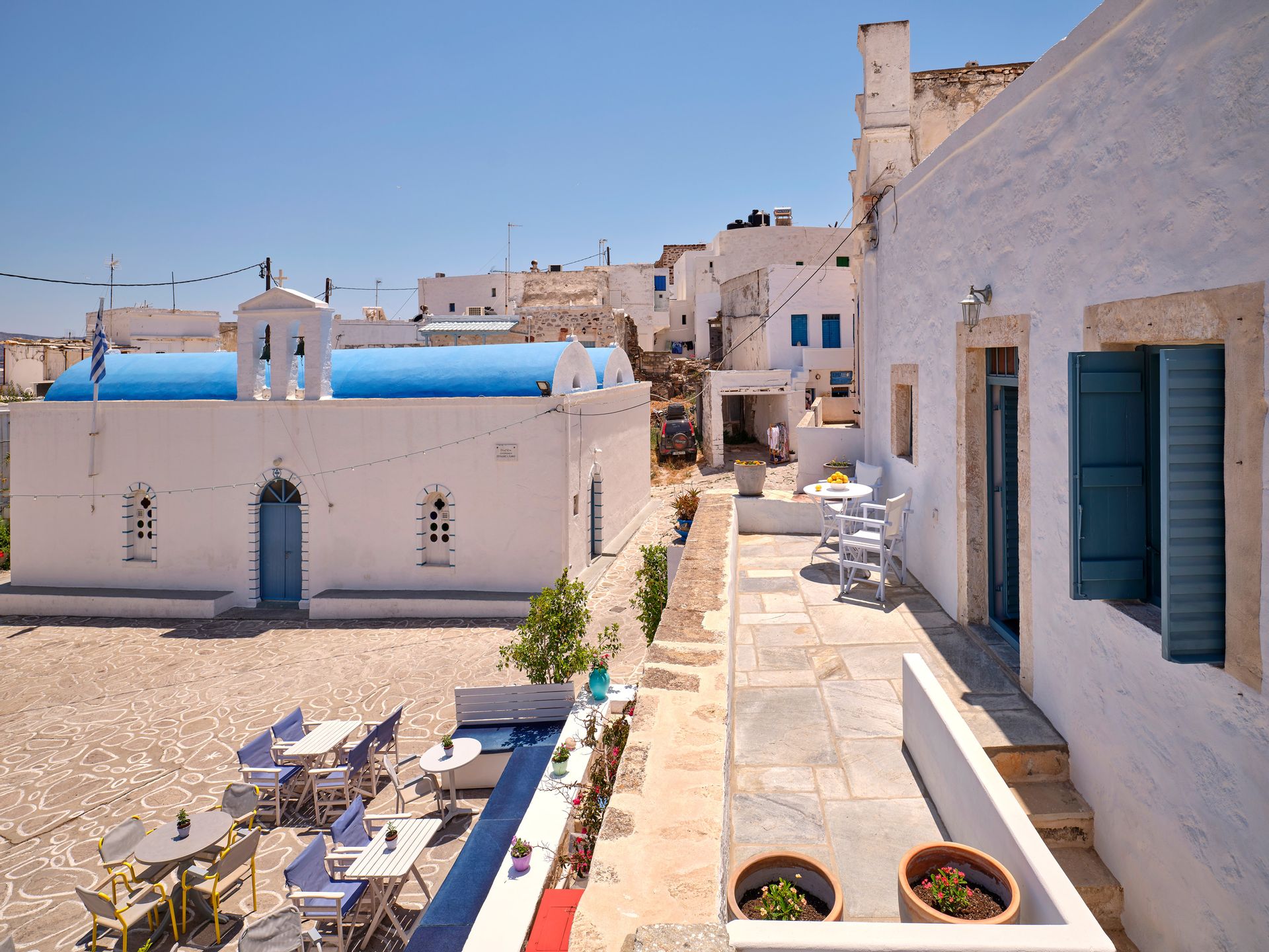 Centrally located in the main square, it is surrounded by shops and restaurants, in short walking distance of the island's nightlife. It offers beautiful views to the Kimolos village and combines traditional architecture with modern elements and comforts.