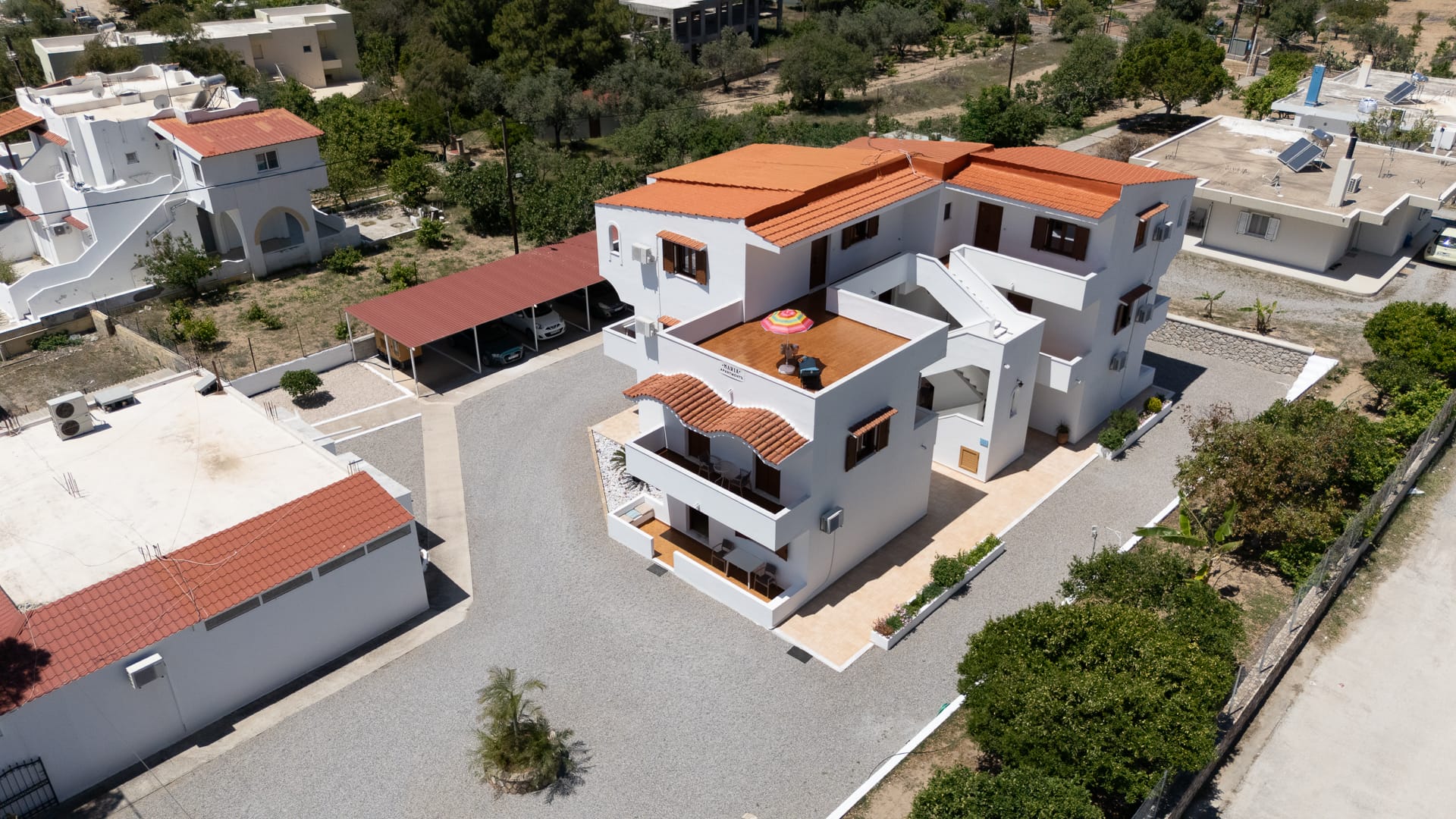 Maria Apartments is an attractive block of nine apartments built on three floors, ground, first and second floors on the Main Beach Road in Pefkos. We offer four two-bedroom apartments, two, one-bedroom apartments and three studio apartments. Each apartment has soundproof windows and doors, its own entrance and key and spacious private verandahs with good views over the surrounding area and our own private gardens. There is CCTV located on the car parking area and front courtyard area. The property has a covered car parking space and also off-road carparking.