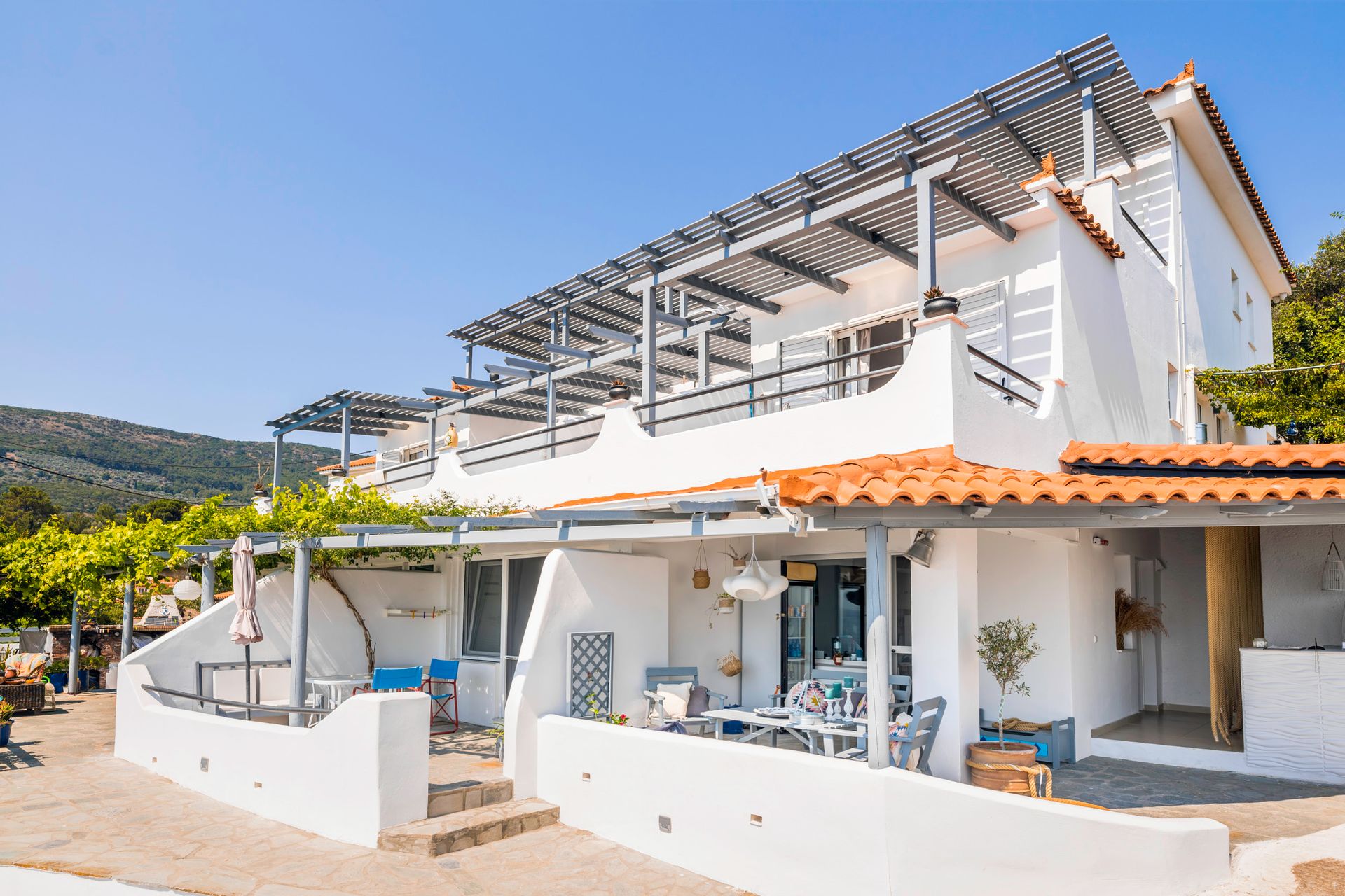Just a few minutes from the beach, in a property of 27000 sq. m. lies Nafsika Villas, surrounded by colourful geraniums, fragrant herbs, and olive trees. All five villas are located in a truly serene setting where tranquillity can only be disturbed by bird songs, while they offer incomparable views of Kerveli Bay and the verdant slopes of the island.