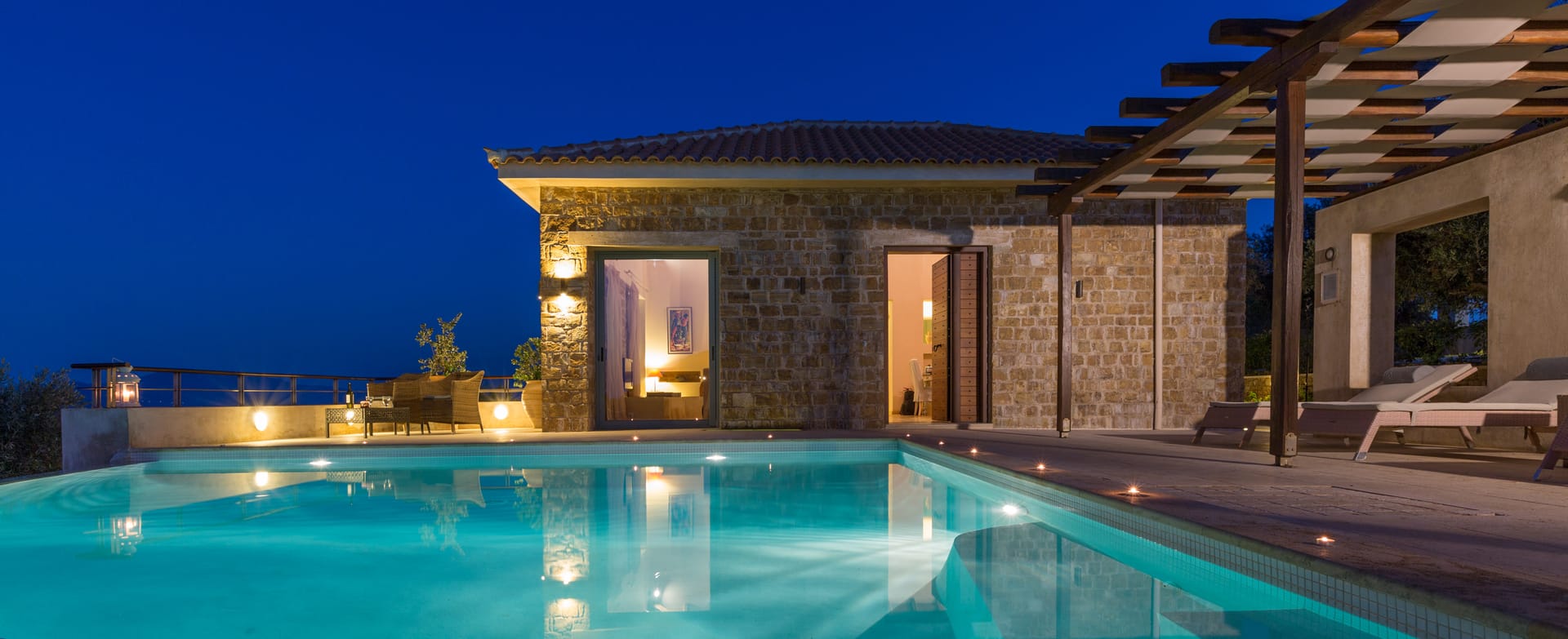 Olivia’s Luxury Villas are two luxurious and elegant villas of 180square meters each, with a private pool and surrounding garden. They are built next to each other so that they can both enjoy the same breathtaking sea view, while at the same time, each house maintains its privacy. The houses built in a contemporary architectural style, are comfortable, sunny, and spacious with stone walls and wooden beams on the ceilings. They are surrounded by olive trees colorful plants and a wonderful private 40sq.m swimming pool each.