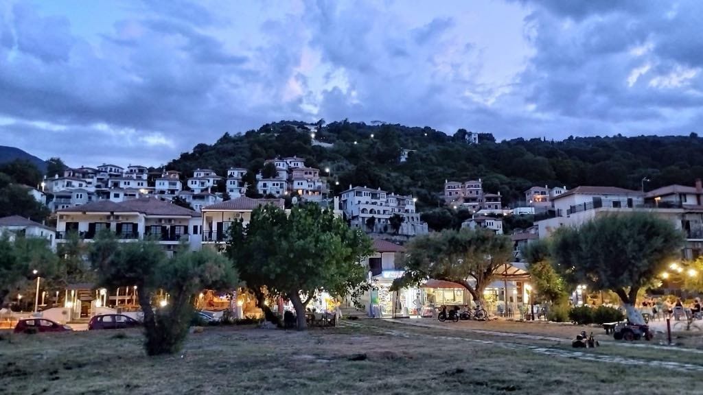 as you enter the town keep following the signs leads to Portaria village and continue at the top of the mountain to Hania village .
